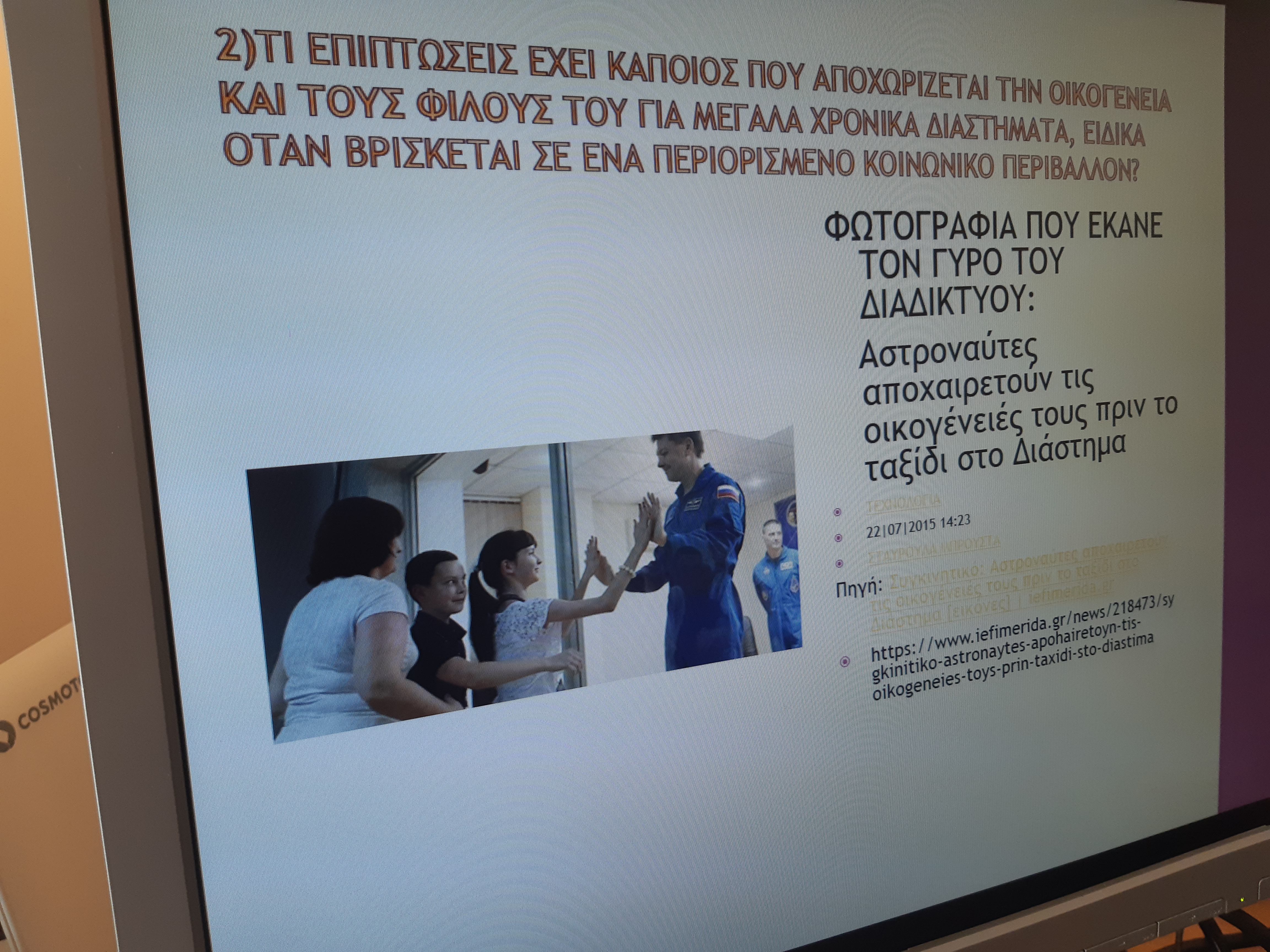 Η παρουσίασή της, ανέδειξε καθημερινά προβλήματα των ανθρώπων είτε είναι στη Γη, είτε στο διάστημα. Η συζήτηση με τα μέλη της ομάδας ήταν πολύ χρήσιμη όχι μόνον για το project αλλά και για το παρόν και το μέλλον τους!