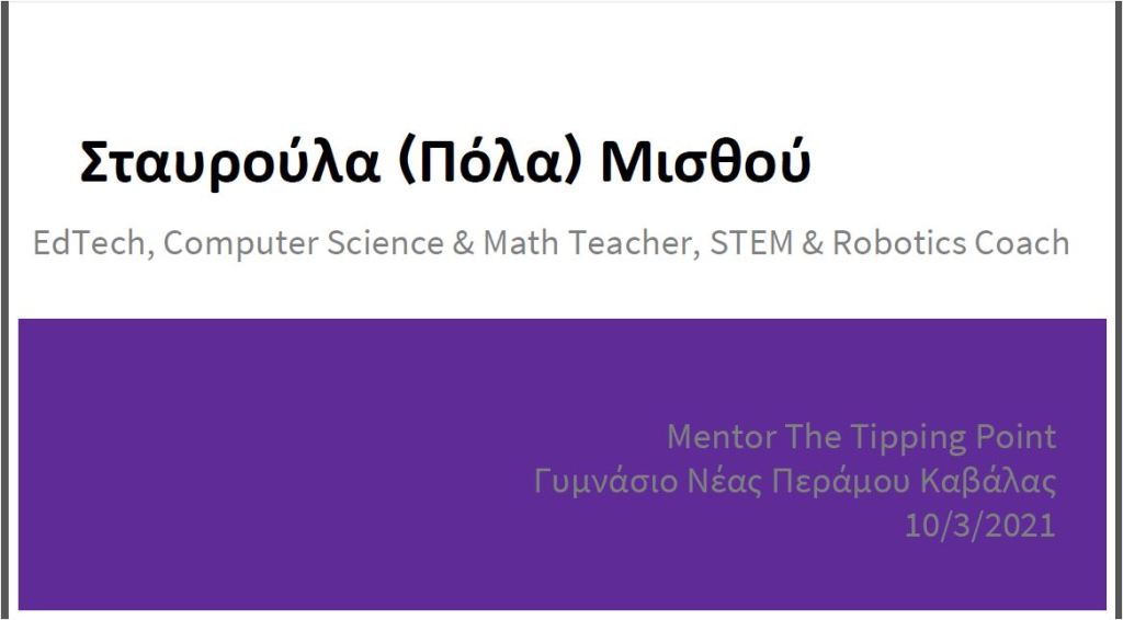 Η ιδρύτρια του Coding Club, Πόλα Μισθού, σε ρόλο μέντορα για το Γυμνάσιο Νέας Περάμου Καβάλας, με το πρόγραμμα “The Tipping Point”.