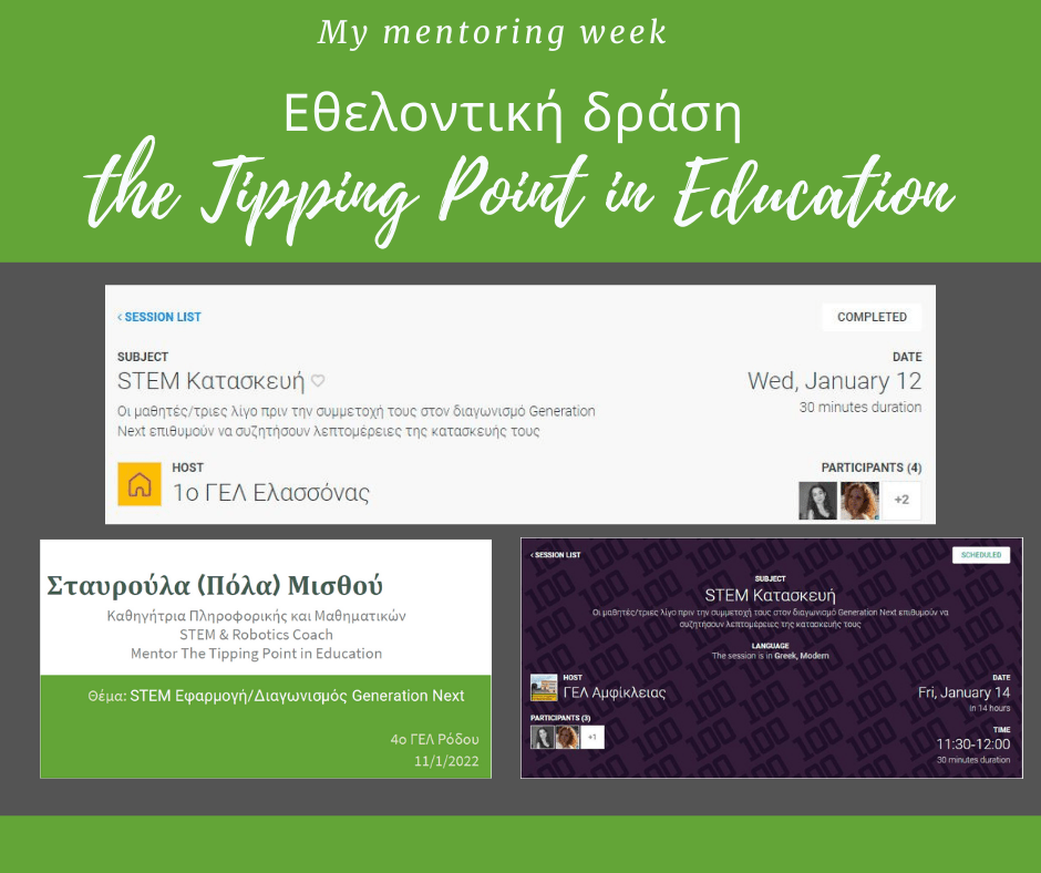 Εβδομάδα με 3 συνεδρίες mentoring με την δράση The Tipping Point in Education: Ρόδος, Ελασσόνα και Αμφίκλεια. Οι εκπαιδευτικοί με τους μαθητές και τις μαθήτριες, δημιουργούν ομάδες που ψηλαψίζουν τα προβλήματα των περιοχών τους και προσπαθούν να βρουν λύσεις με STEM.