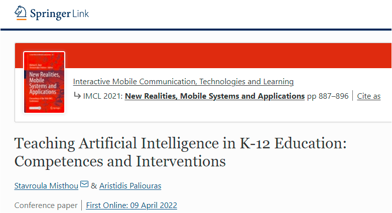To paper για #AIEducation που παρουσιάσαμε με τον Aris Paliouras στο IMCL 2021, δημοσιεύθηκε στις 9/4/2022, στο Springer, New Realities, Mobile Systems and Applications, pp 887–896.
