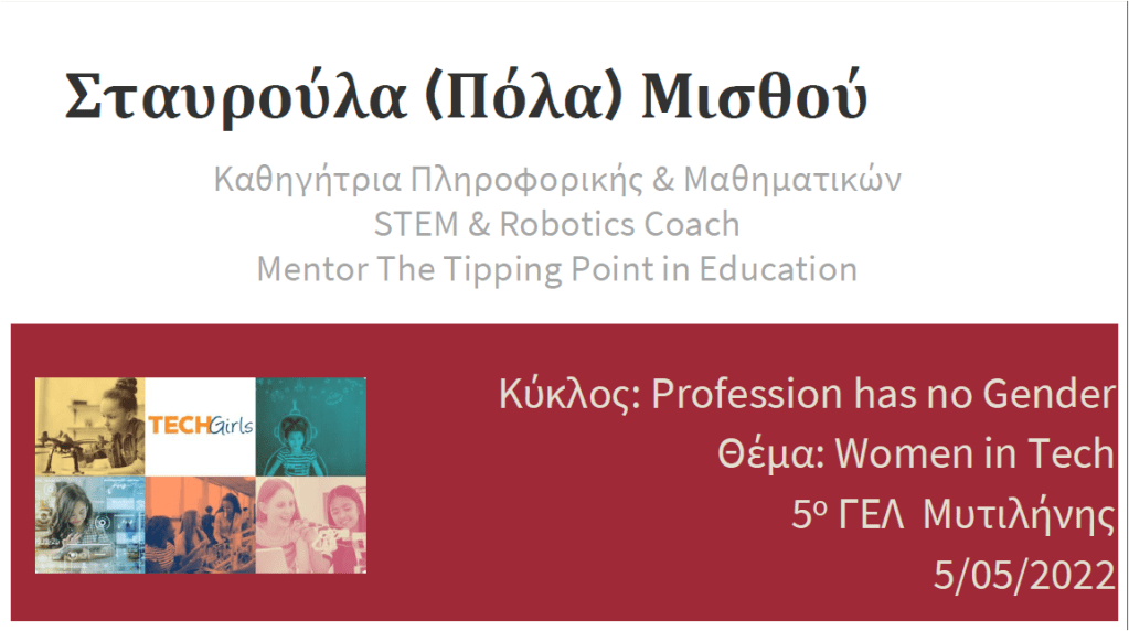 Στη 19η συνεδρία μου με τη δράση “The Tipping Point”, τις 5/5/2022 “επισκέφθηκα” διαδικτυακά τις μαθήτριες και τους μαθητές της Α΄ Λυκείου του 5ου ΓΕΛ Μυτιλήνης και τους καθηγητές τους. Είχαν υποβάλει πολλές και ενδιαφέρουσες ερωτήσεις και συζητήσαμε για το έμφυλο ψηφιακό χάσμα που παρατηρείται στην αγορά εργασίας που αφορά την τεχνολογία και την υποεκπροσώπηση των γυναικών στο STEM. 👩🔬 👩💻