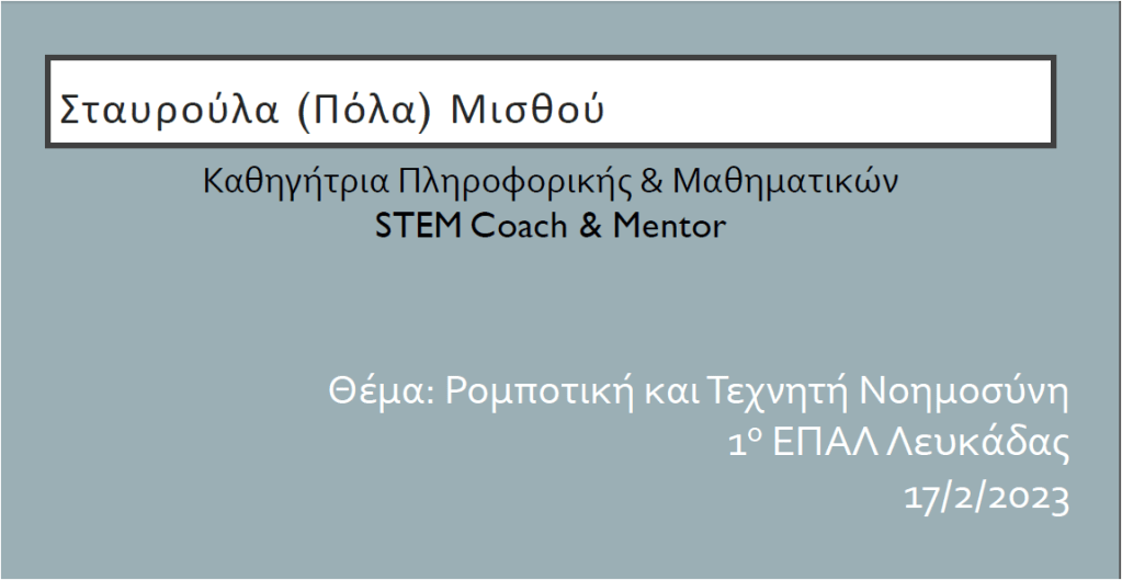 Για 3η φορά επισκέφθηκα διαδικτυακά το 1ο ΕΠΑΛ Λευκάδας με τη Δράση The Tipping Point και συζητήσαμε για τους Διαγωνισμούς Ρομποτικής και Τεχνητής Νοημοσύνης που γίνονται στην Ελλάδα καθώς και για τους Διεθνείς διαγωνισμούς.