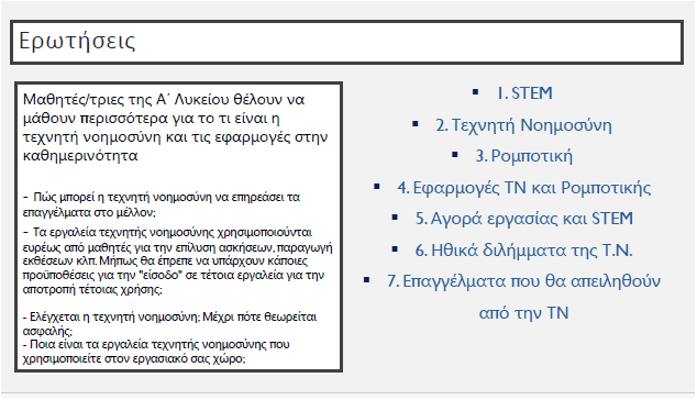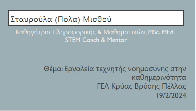 Στις 19/2/2024 πραγματοποίησα την 37η εθελοντική μου συνεδρία mentoring με τη δράση “The Tipping Point in Education” και είχα την ευκαιρία να συνομιλήσω με το ΓΕΛ Κρύας Βρύσης Πέλλας. Το ενδιαφέρον εστιάστηκε στο STEM, την Τεχνητή Νοημοσύνη και την Ρομποτική. Συζητήσαμε τους τομείς εφαρμογής της Τεχνητής Νοημοσύνης και Ρομποτικής καθώς και καθημερινές εφαρμογές της Τ.Ν. που ήδη χρησιμοποιούμε στη ζωή μας.