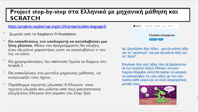 Αναφερθήκαμε σε επαγγέλματα που θα αντιμετωπίσουν πιθανές απειλές λόγω της Τεχνητής Νοημοσύνης, αλλά και για τις ευκαιρίες που προκύπτουν από την καινοτομία σε αυτούς τους τομείς. Τέλος είδαμε το Project step-by-step στα Ελληνικά με μηχανική μάθηση και SCRATCH “Γλώσσα εξωγήινου”.