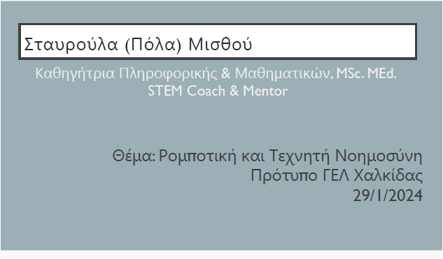 Στις 29 Ιανουαρίου 2024 πραγματοποίησα μια ακόμα συνεδρία mentoring με τη δράση “The Tipping Point in Education”. Η συνάντηση ήταν διαδικτυακή και είχα την ευκαιρία να συνομιλήσω με το Πρότυπο ΓΕΛ Χαλκίδας. Το ενδιαφέρον εστιάστηκε στην Τεχνητή Νοημοσύνη και την Ρομποτική, δύο κλάδους που διαμορφώνουν το μέλλον της εκπαίδευσης και της εργασίας. Συζητήσαμε ενδιαφέρουσες πτυχές του STEM και της Ρομποτικής, καθώς και τους τομείς που συνδέονται στενά με την εφαρμογή της Τεχνητής Νοημοσύνης.