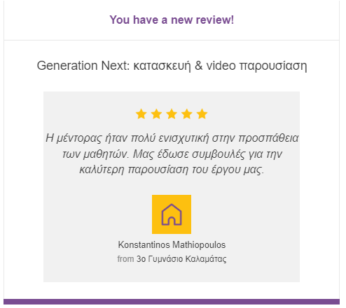 10/4/2024: Στην 41η συνεδρία mentoring με το πρόγραμμα “The Tipping Point in Education”, είχα την ευκαιρία να συνδεθώ διαδικτυακά με την ομάδα της Α’ Γυμνασίου που συμμετέχει στο διαγωνισμό Generation Next του 3ου Γυμνασίου Καλαμάτας. Κατά τη διάρκεια της συνάντησης, η ομάδα παρουσίασε το πρόβλημα που θέλει να επιλύσει, την κατασκευή καθώς την εφαρμογή που έχει δημιουργήσει. Συζητήσαμε θέματα προστασίας προσωπικών δικαιωμάτων, συνεργασία με τον Δήμο και προτάσεις για την καλύτερη παρουσίαση του έργου τους.