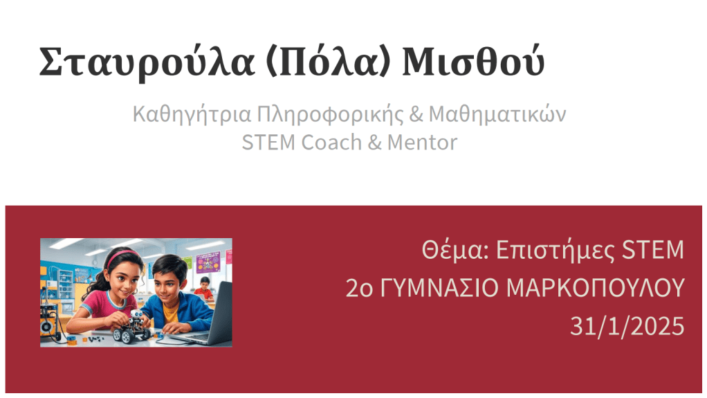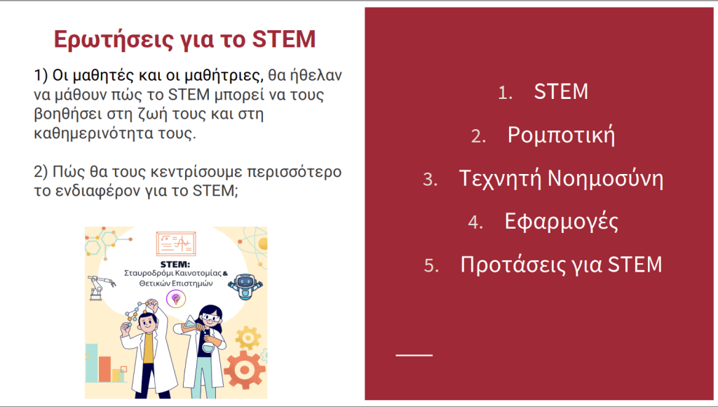 Οι μαθητές και οι μαθήτριες ρώτησαν για τις εφαρμογές του STEM στην καθημερινότητά μας (πού τις βλέπουμε) και αν θα χαθούν επαγγέλματα από την Τεχνητή Νοημοσύνη. Στην παρουσίασή μου έκανα προτάσεις για συμμετοχή σε διεθνείς δωρεάν online διαγωνισμούς STEM.