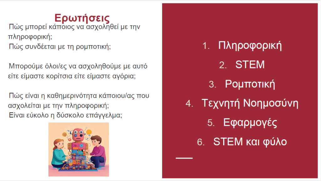 Οι μαθητές και οι μαθήτριες ήθελαν να ενημερωθούν για την Πληροφορική, τη Ρομποτική και για το αν τα κορίτσια μπορούν να ασχοληθούν με την Πληροφορική. Μετά την παρουσίασή μου, τα παιδιά υπέβαλαν πολλές ερωτήσεις για την επαγγελματική μου πορεία, για τυχόν δυσκολίες επειδή ήμουν γυναίκα, για το μέλλον της Τεχνητής Νοημοσύνης και την απώλεια επαγγελμάτων. Τέλος ζήτησαν συμβουλές για τη δημιουργία παιχνιδιών.