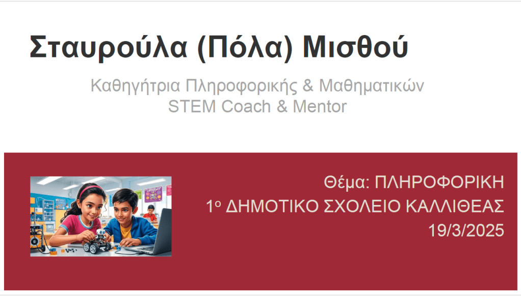 Στις 19/3/2025 έγινε η 46η συνεδρία μου Mentoring με το πρόγραμμα “The Tipping Point in Education” με μαθητές/τριες της Στ΄ τάξης του 1ου Δημοτικού Σχολείου Καλλιθέας.