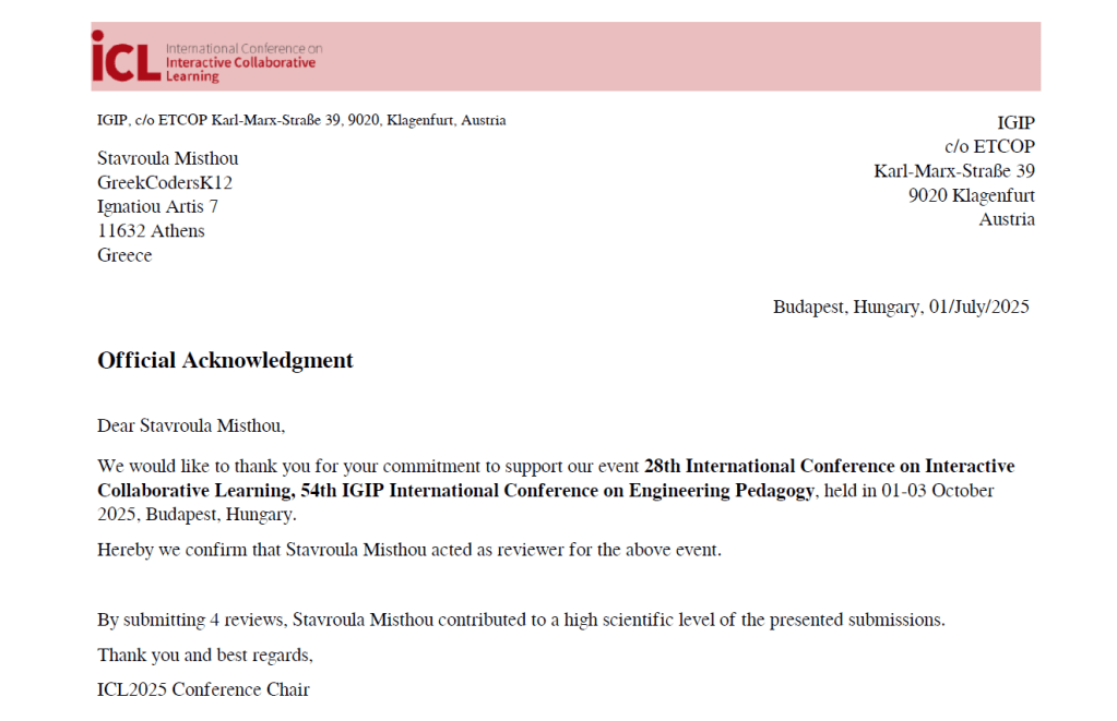 Ευχαριστώ θερμά τη διοργάνωση του ICL2025 για την εμπιστοσύνη και την επίσημη αναγνώριση της συμμετοχής μου ως “Reviewer” (κριτής) στο 28th International Conference on Interactive Collaborative Learning και στο 54th IGIP International Conference on Engineering Pedagogy, που θα λάβει χώρα τον Οκτώβριο 2025 στη Βουδαπέστη.