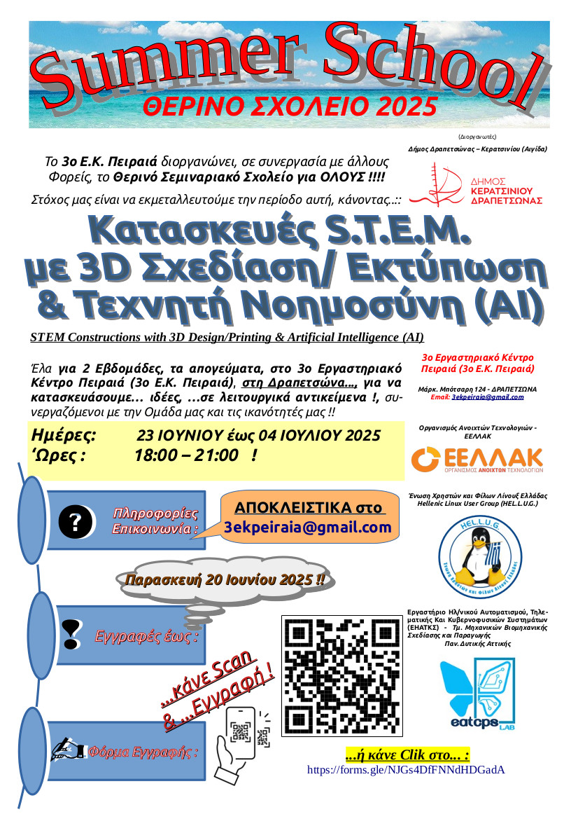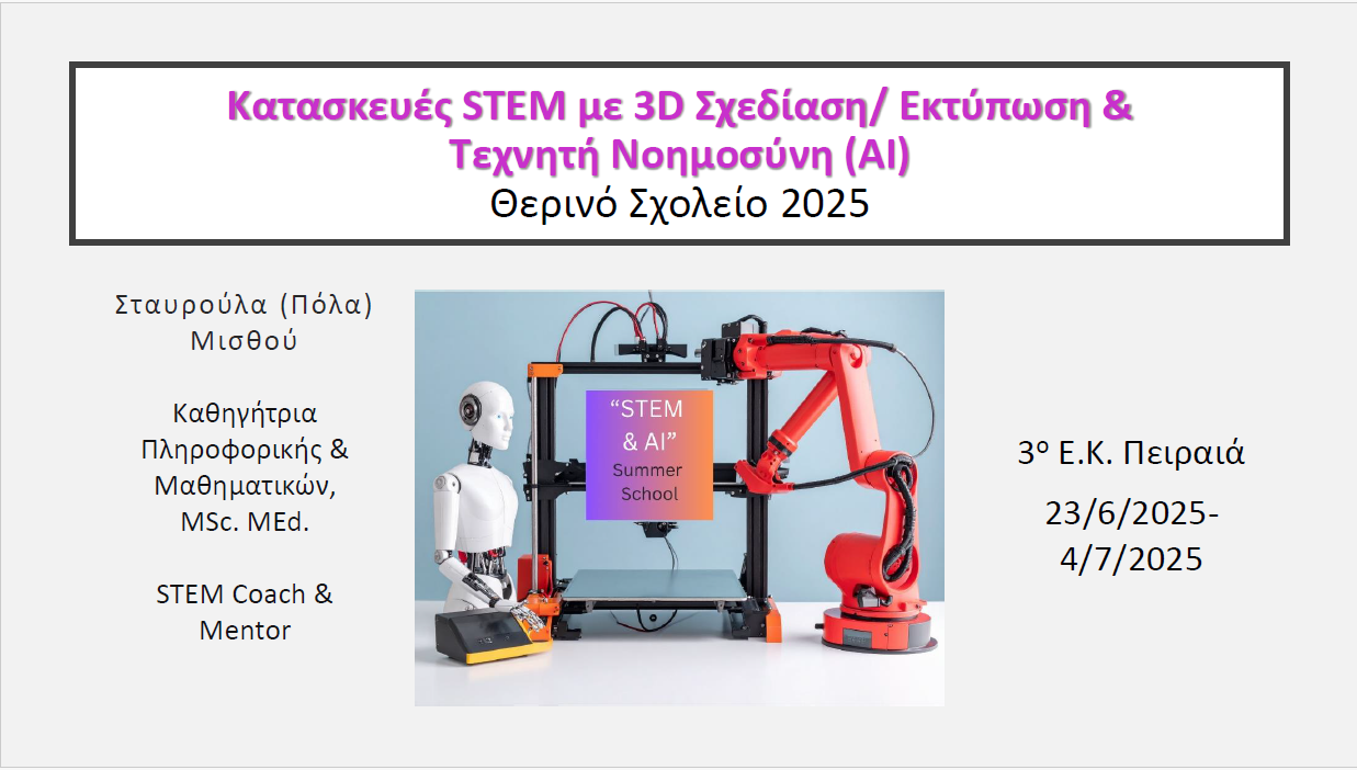 Με πολλή χαρά συμμετείχα ως προσκεκλημένη ομιλήτρια στο Θερινό Σχολείο του 3ου Ε.Κ. Πειραιά που διοργάνωσε ο κ. Ιάκωβος Στέλλας. Η δική μου συνεισφορά αφορούσε 2 παρουσιάσεις για το STEM και την Τεχνητή Νοημοσύνη στις 30/6/2025 και 1/7/2025. ![]()