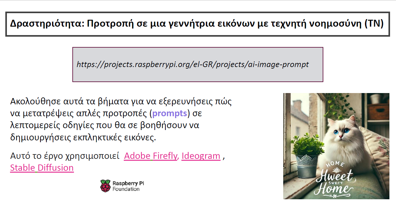 Επίσης έγινε παραγωγή εικόνων μέσα από μοντέλα Τ.Ν. από το μονοπάτι Τεχνητή νοημοσύνη του Raspberry Pi Foundation, https://projects.raspberrypi.org/el-GR/pathways/ai-toolkit