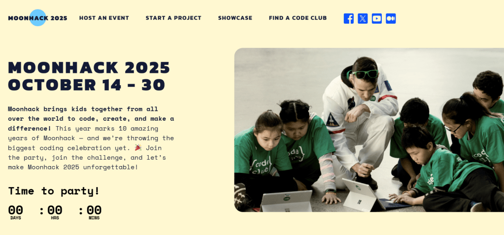 Ως μέλη της Ελληνικής Εθελοντικής Μεταφραστικής Ομάδας του Raspberry Pi Foundation, με τον Μάνο Ζεάκη, μεταφράσαμε στα Ελληνικά, 6 έργα του Moonhack 2025: 3 έργα SCRATCH, 1 Python, 1 Micro:bit και ένα ελεύθερο έργο. To Moonhack γιορτάζει 10 χρόνια και καλεί όλα να τα παιδιά να συμμετάσχουν σε ένα πάρτι κώδικα. 🙌🎉