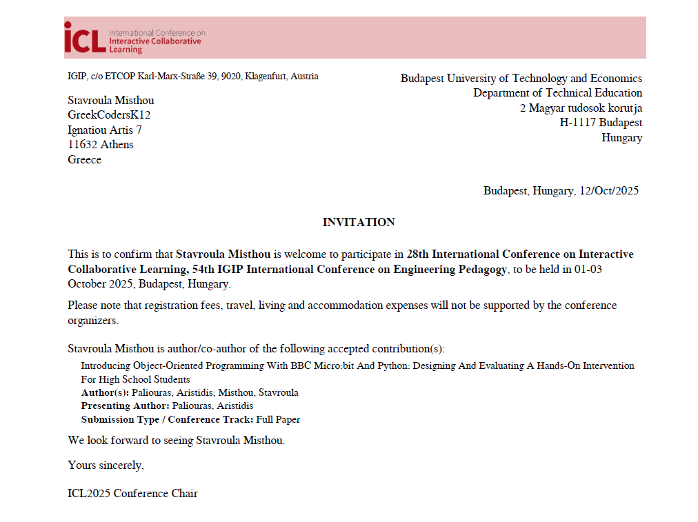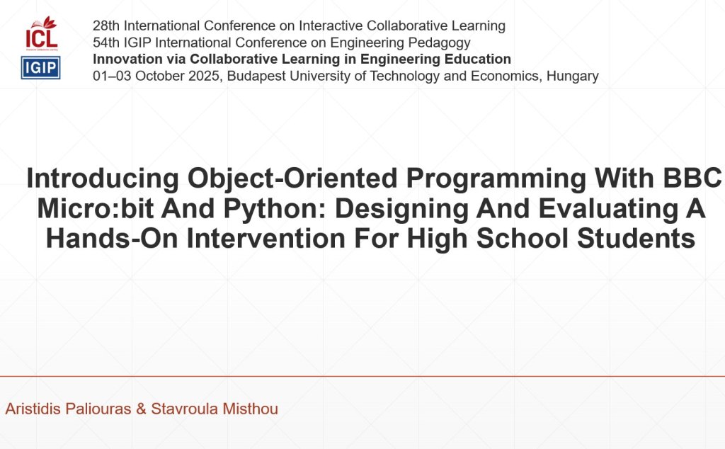 I was delighted to collaborate with Aris Paliouras on the submission of our paper entitled “Introducing Object-Oriented Programming With BBC Micro:bit And Python: Designing And Evaluating A Hands-On Intervention For High School Students” to the prestigious 28th International Conference on Interactive Collaborative Learning & 54th IGIP International Conference on Engineering Pedagogy Conference 2025 in Budapest (ICL 2025).